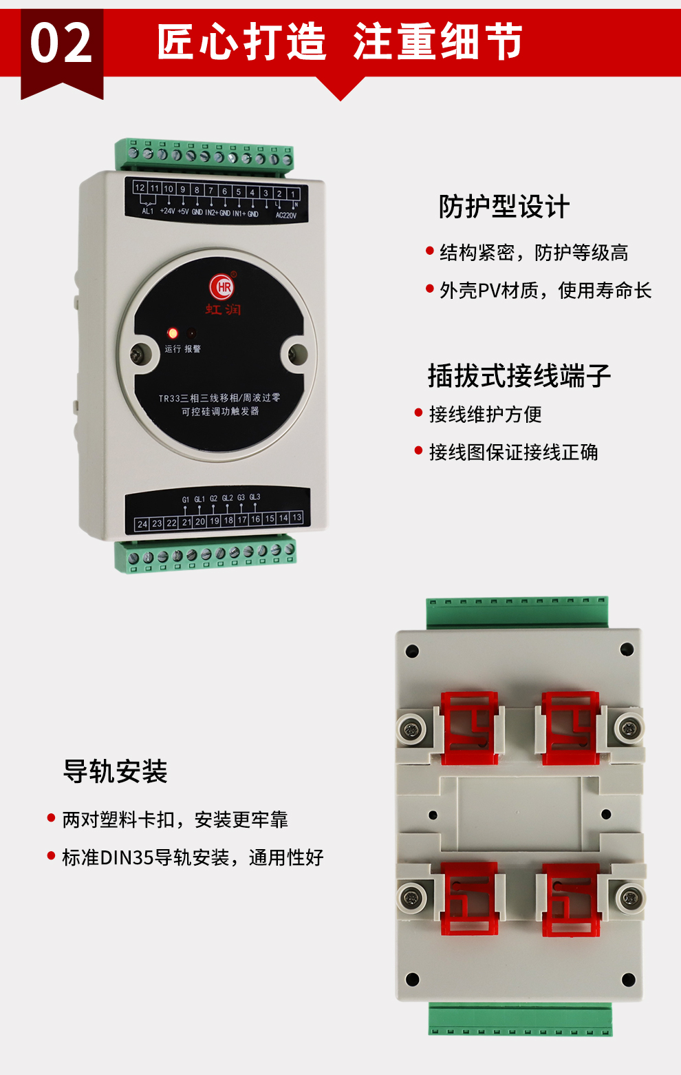 虹潤公司是專業(yè)生產(chǎn)移相觸發(fā)器的國家專精特新“小巨人”企業(yè),生產(chǎn)的移相觸發(fā)器,具有采用光電隔離設(shè)計,自動同步功能,過流保護(hù)技術(shù),電源缺相檢測,信號超限報警等特點。產(chǎn)品獲得巡回檢測顯示方法及裝置、儀表殼體等2項國家發(fā)明專利,主持起草工業(yè)過程控制系統(tǒng)用模擬輸入兩位或多位輸出儀表、物聯(lián)網(wǎng)智能溫度儀表通用技術(shù)條件等2項國家標(biāo)準(zhǔn)以及通信系統(tǒng)多通道數(shù)據(jù)采集控制終端規(guī)范軍用標(biāo)準(zhǔn),參與國際5G標(biāo)準(zhǔn)制定,取得外置移相觸發(fā)器等2項相關(guān)軟件著作權(quán)。產(chǎn)品廣泛應(yīng)用于工業(yè)溫控、電極控制、航天軍工、電爐溫控、食品醫(yī)藥等諸多領(lǐng)域。