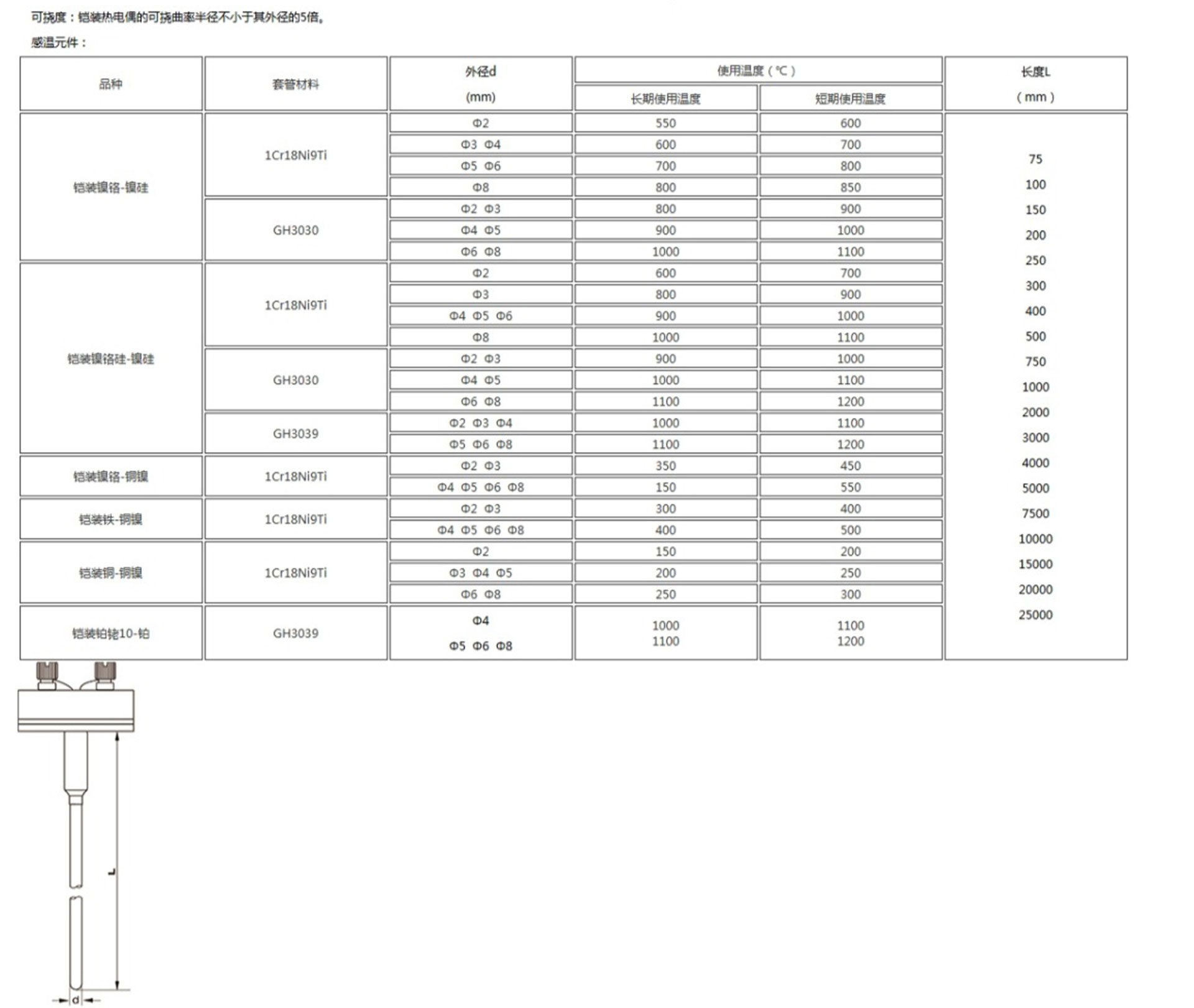 鎧裝熱電偶作為溫度測量傳感器,通常與溫度變送器、調(diào)節(jié)器及顯示儀表等配套使用,組成過程控制系統(tǒng),用以直接測量或控制各種生產(chǎn)過程中0-1800℃范圍內(nèi)的流體、蒸汽和氣體介質(zhì)以及固體表面等溫度。鎧狀熱電偶具有能彎曲、耐高壓、熱響應時間快和堅固耐用等許多優(yōu)點。