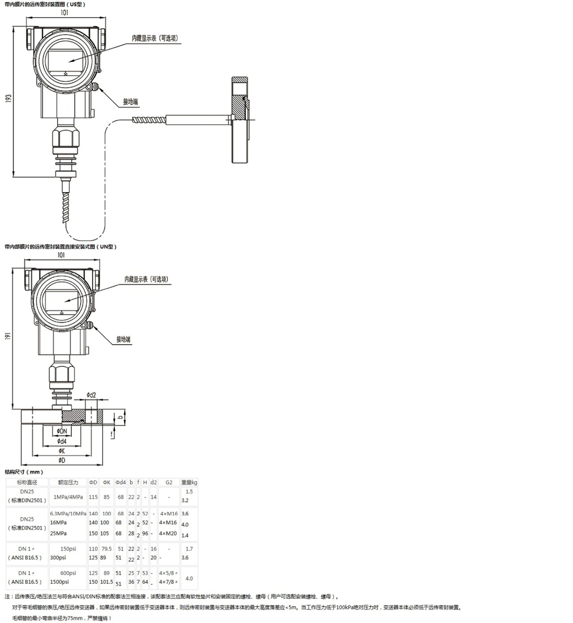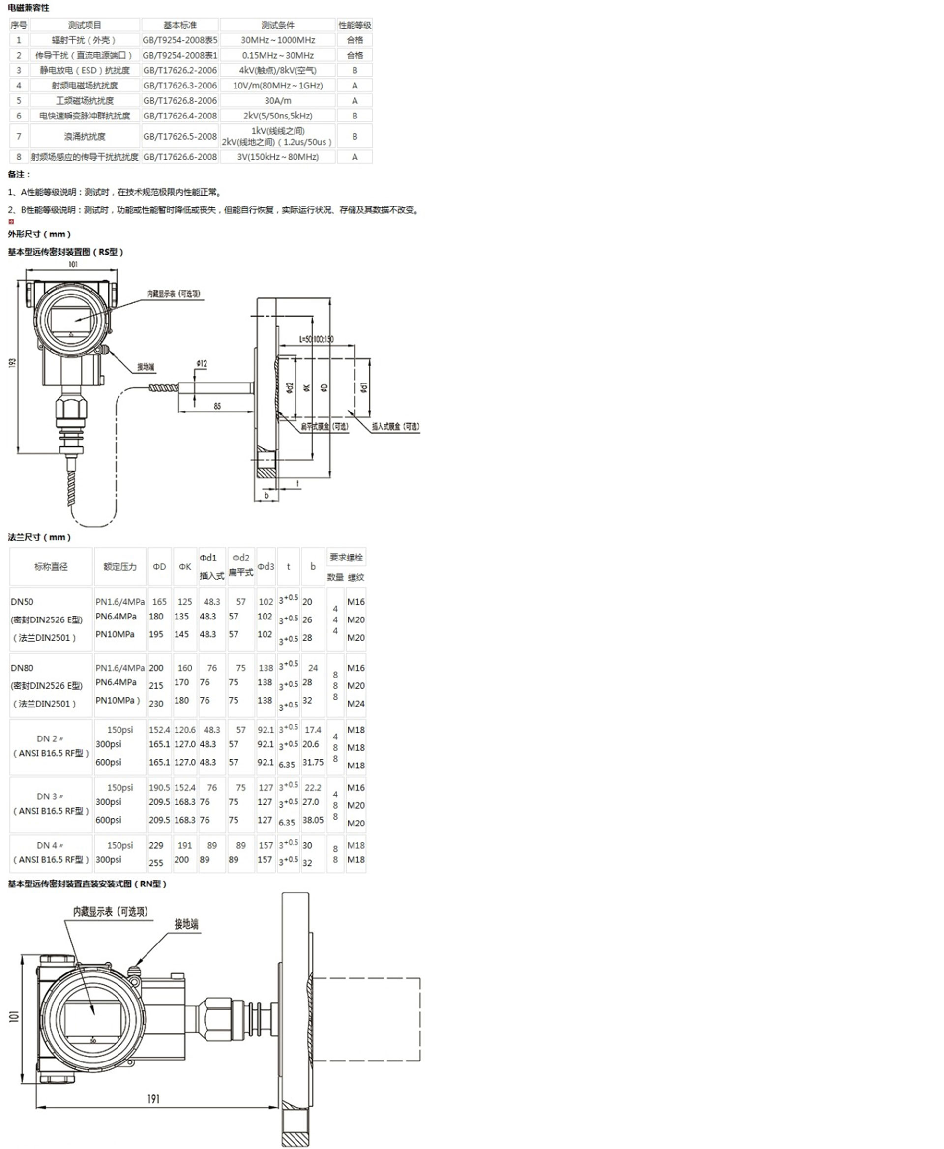 該產(chǎn)品用于測(cè)量液體、氣體或蒸汽的液位、密度、壓力,將其轉(zhuǎn)變成4~20mA (HART)電流輸出信號(hào),可通過(guò)RST375手持終端對(duì)它們進(jìn)行參數(shù)設(shè)定、過(guò)程監(jiān)控等。測(cè)量范圍(未遷移時(shí))為0-6kPa~25MPa,液位法蘭的額定壓力分別為:1.6/4MPa、6.4MPa、10MPa、150psi、300psi或600psi。
